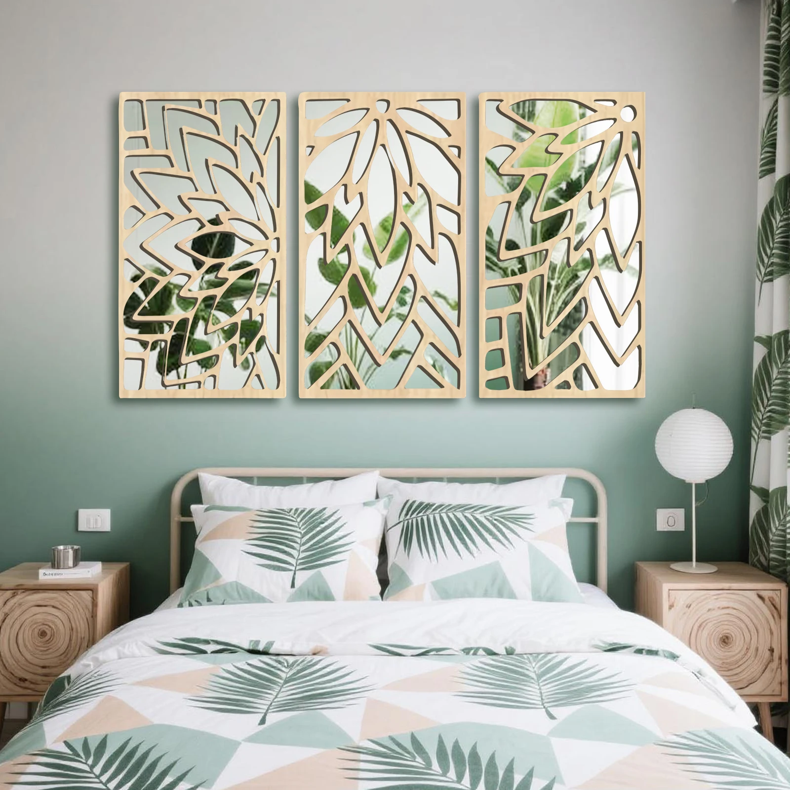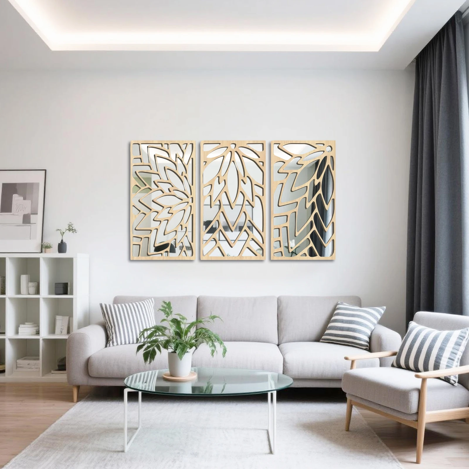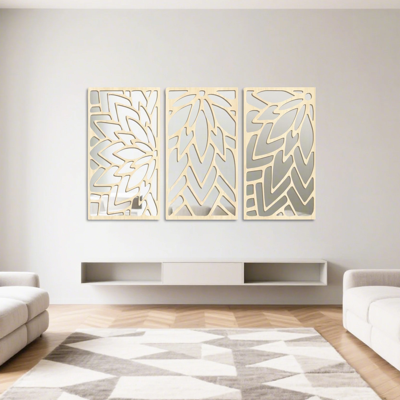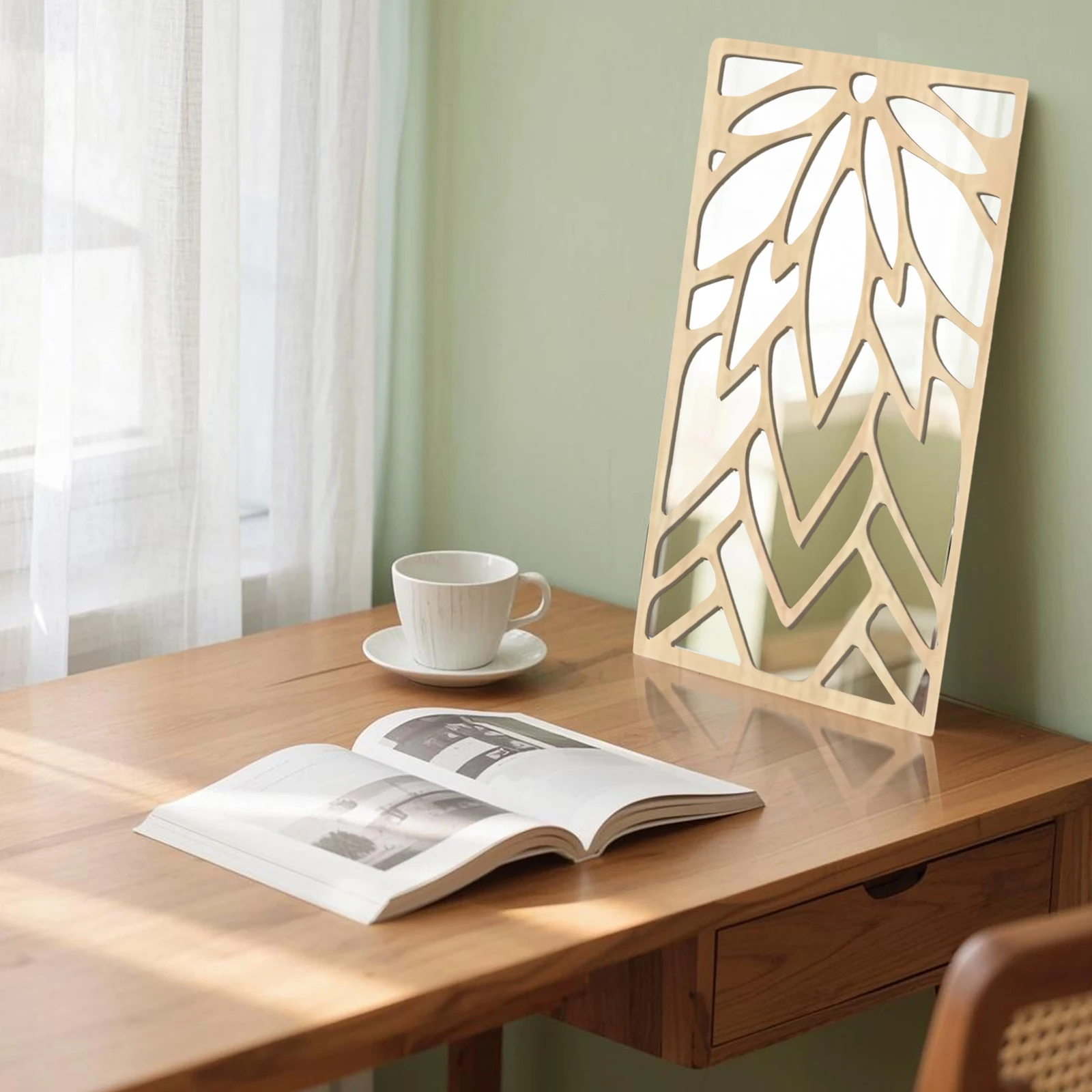 3Pcs 2D 16in Wooden Acrylic Double-Layer Wall Mirror Hollow Leaf Design Refined Lifestyle Artistic Home Decorative Mirror